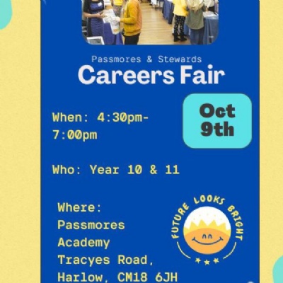 On the 9th October we are hosting a joint careers fair with Stewards Academy. This will be held from 4.30pm-7.00pm at Passmores Academy. Almost all the local colleges and sixth forms will be attending alongside Anglia Ruskin University, Manchester Airport Group Stansted, Derrick Wade Waters, The Army, Kidz Ok, Derrick Wade Waters, Group 1 Auto, Ashton Roofing,and many more. It is an ideal opportunity for our students to talk to a range of post 16 providers under one roof to find out about courses, apprenticeships and career opportunities.